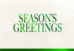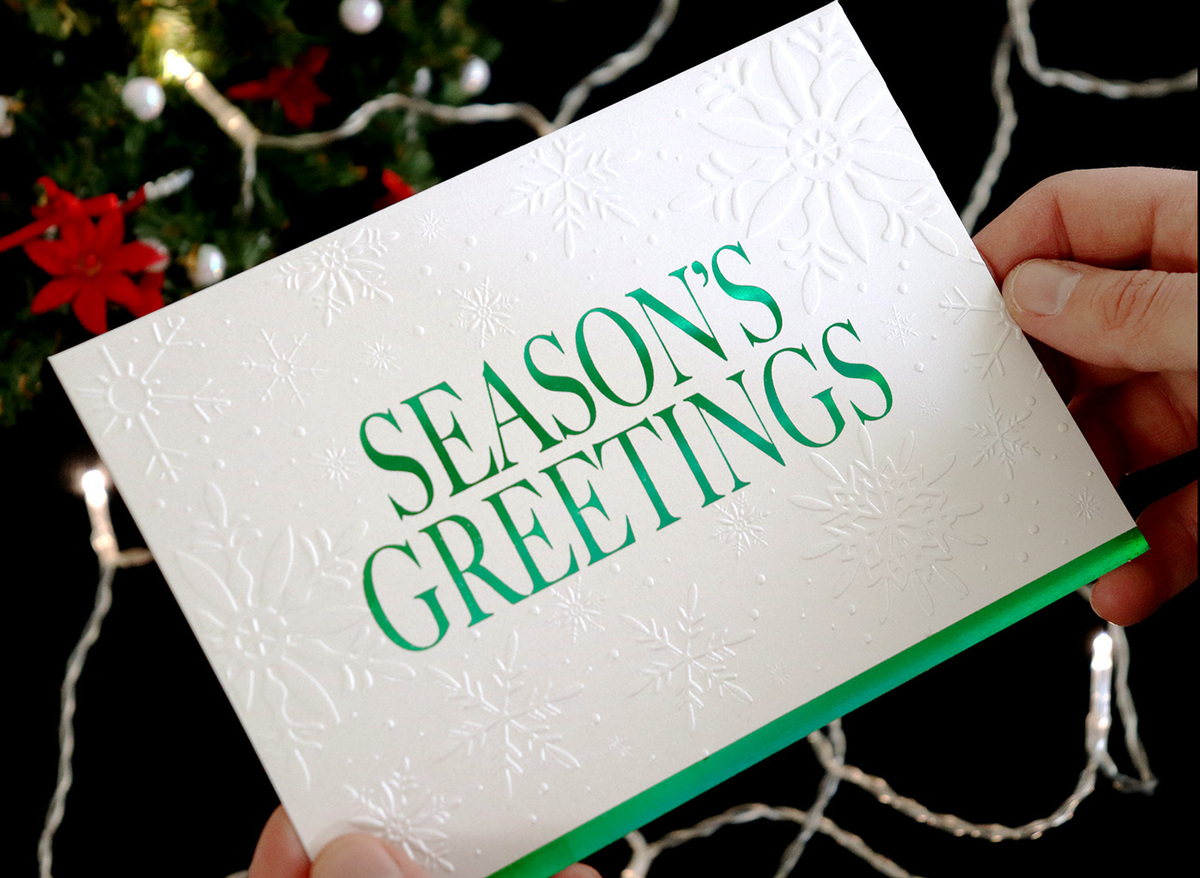 A subtle Christmas card design with a bit of wintry shimmer. Embossed snowflakes on pearlescent paper stock with green holographic foil accents are reminiscent of a serene winter scene. Delight clients, customers, and employees with personal Christmas cards this year.